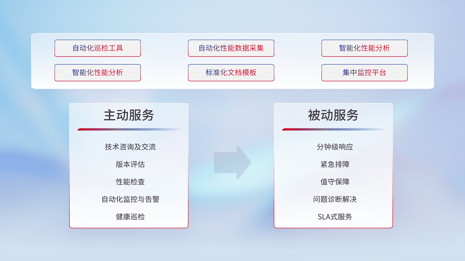 智能化工具和标准化文档,,,,保障服务质量,,提供主动服务(包含技术咨询、、、版本评估、、、性能检查、、自动化监控与告警、、健康巡检)和被动服务包含(分钟级响应、、、、紧急排障、、、、值守保障、、、问题诊断解决、、、、SLA服务)。。